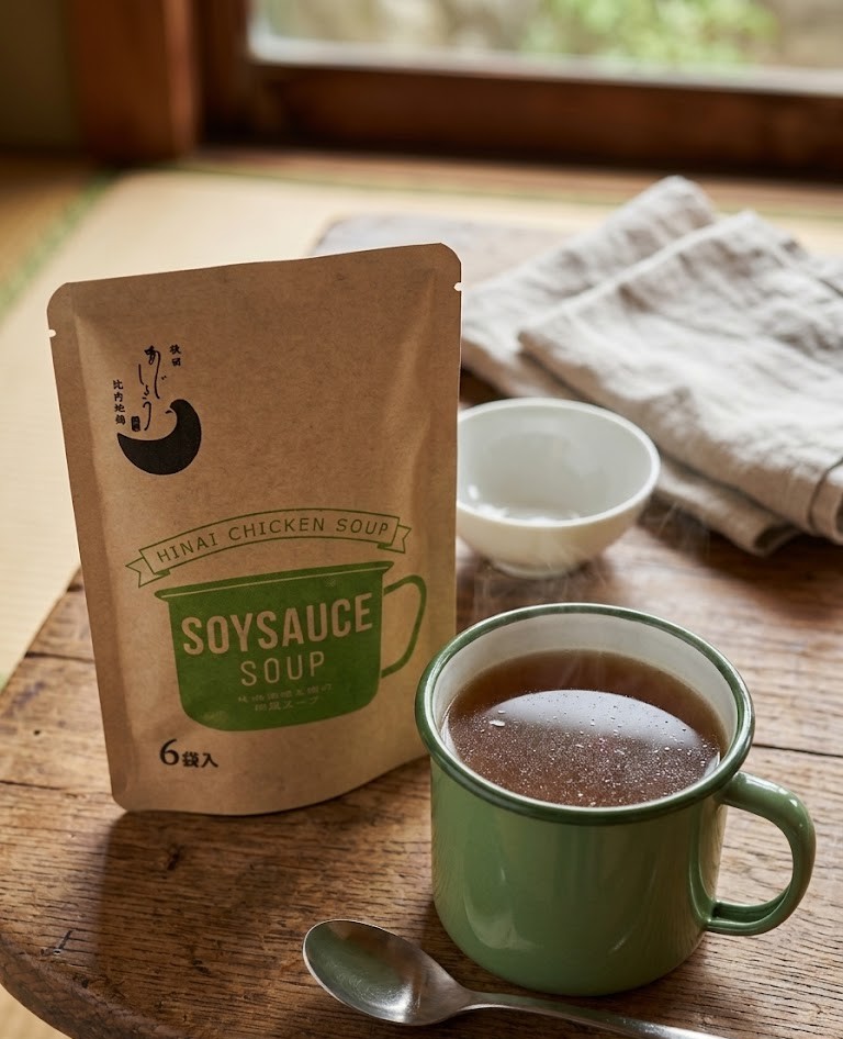 比内地鶏の鶏ガラをベースに、鰹や椎茸の旨みを凝縮。お湯を注ぐだけで本格的な醤油味の和風スープが完成する、個食タイプの液体スープです。